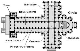 El la arquitectura los templos se construían en piedra y tenían plantas llamadas cruz latinas. Hacían una o dos bases que comunicaban en un ábside, la girola que pasaba por detrás del altar mayor y el crucero que era la parte mas corta de la nave. Hacían arcos de media punta y gruesas columnas y pilares.